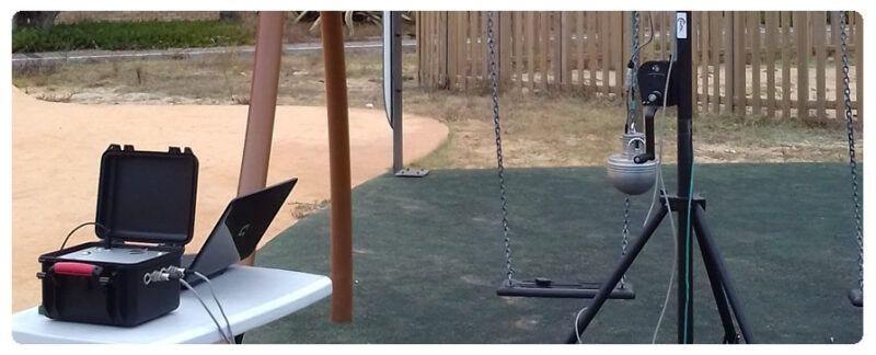 Ensaio de pisos amortecedores, realizado de acordo com a norma EN 1177:2018+A1:2023, para determinação do HIC (Head Injury Criterion), da Altura Crítica de Queda (Critical Fall Height – CFH) e da desaceleração máxima “g” no impacto, aplicado em: